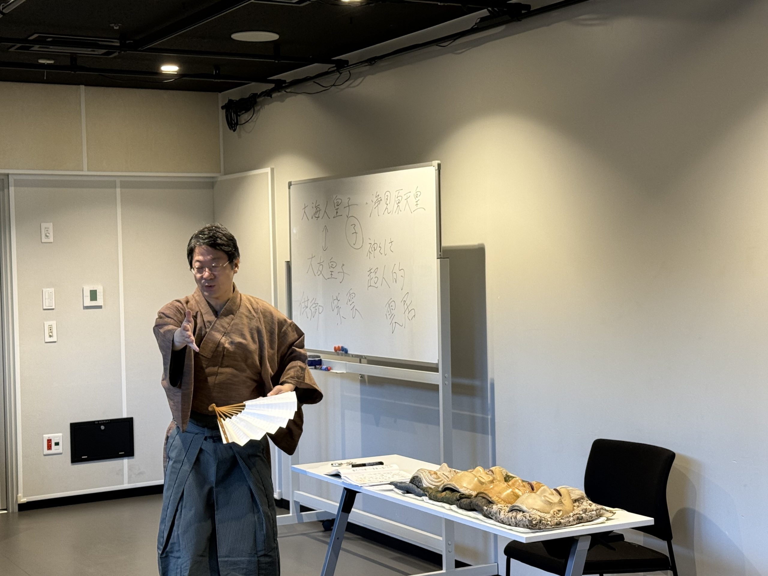 尉(お爺さん)の面をなんと4種類も先生が持ってきてくださり、それぞれを比較しながらお話を
