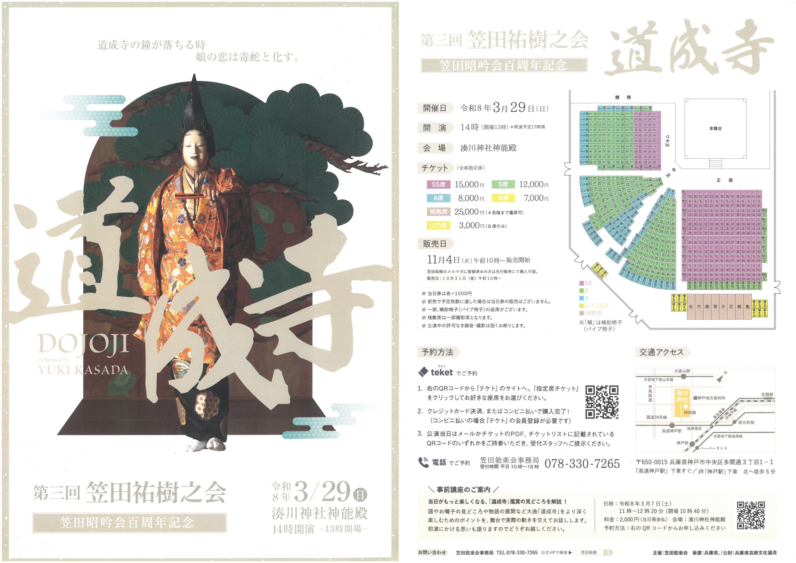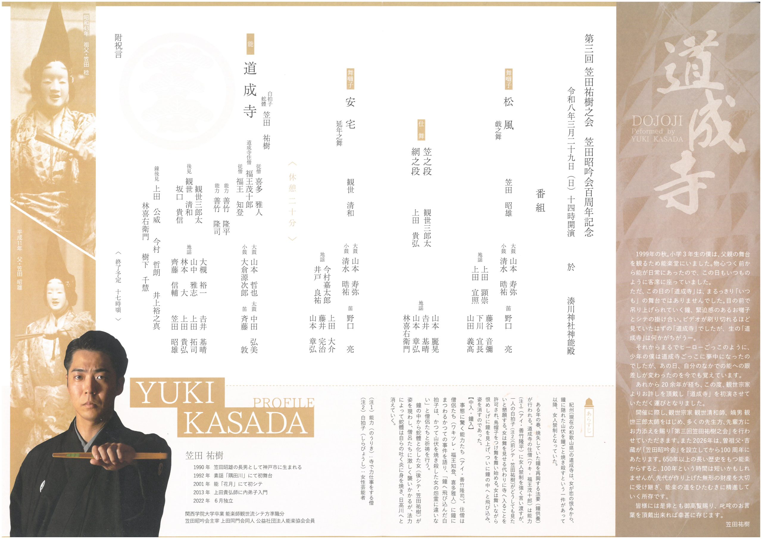 ご案内が遅くなりました。いつも私の公演を力強く助けてくださいます頼もしい後輩、笠田祐樹さん。神戸の上田家にて厳しい修行を経て独立され、今も神戸でご活躍です。この祐樹さんが、「能楽師の卒業論文」と言える大曲「道成寺」に挑戦されます。