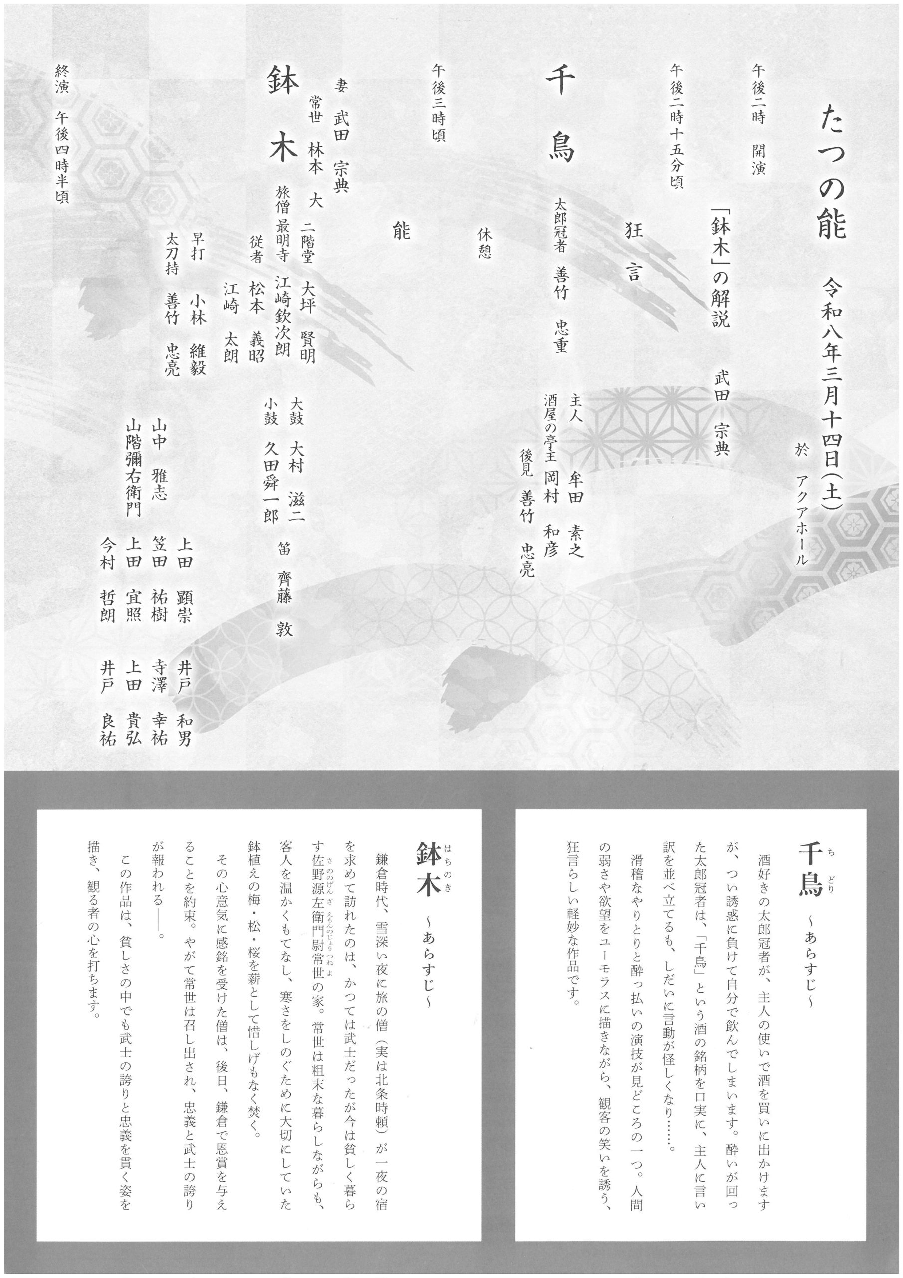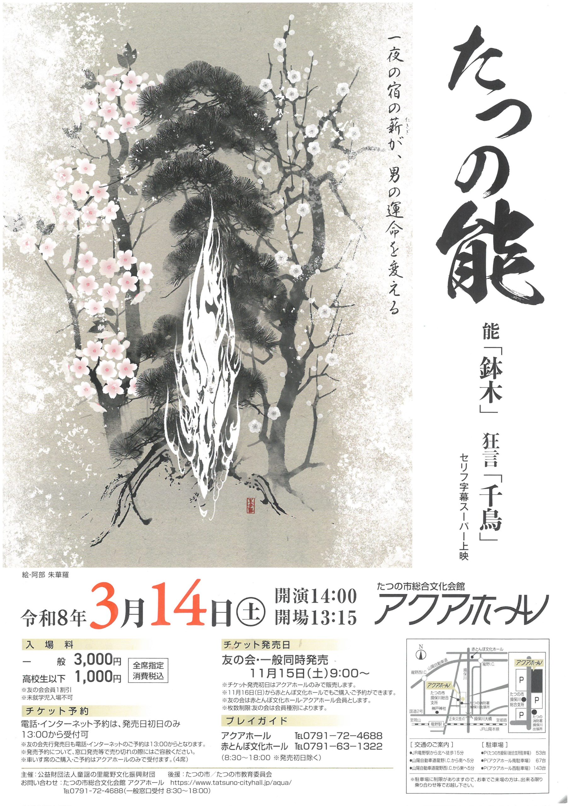 大曲を勤めさせていただく事になりました。毎年伺い、最近はよく解説を担当しております、「たつの能」。兵庫県たつの市