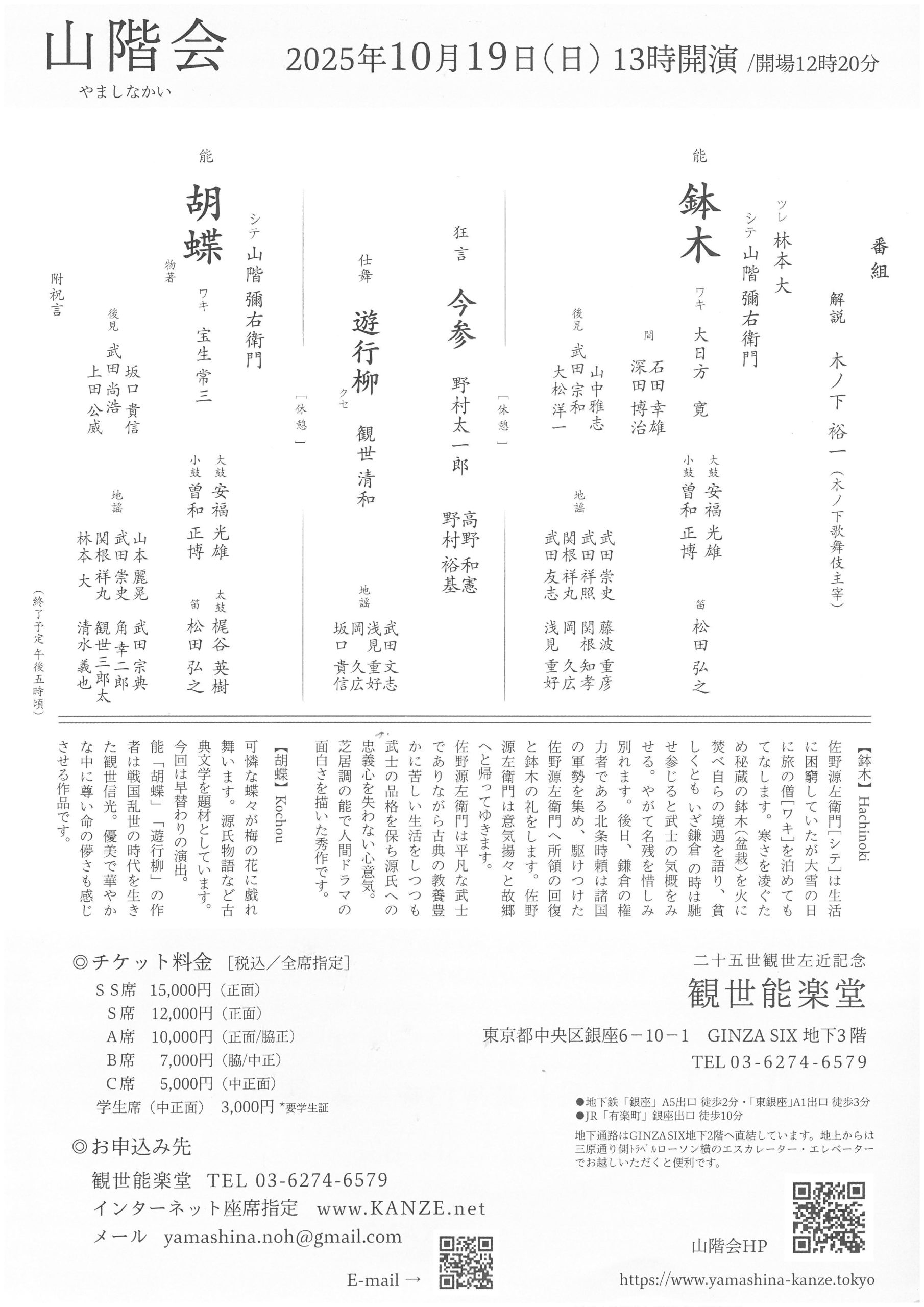 私は大曲「鉢木」のツレである、佐野常世の妻役をつとめさせていただきます。私自身、来年3月14日に兵庫県たつの市にて行われます「たつの能」にてこの「鉢木」の主役を演じることになっていますので、今回の山階会で大いに勉強させていただきたいと思っております。この日は能がもう一曲、蝶の精が華やかに舞う「胡蝶」も上演されます。他に狂言など盛りだくさんです。